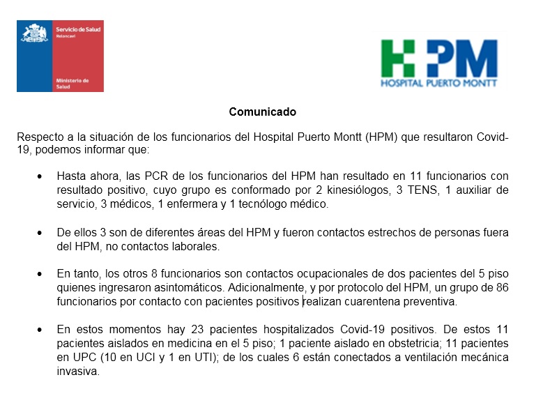 2 kinesiologos, 3 técnicos paramédicos, 1 auxiliar de servicio, 3 médicos, 1 enfermera y un tecnólogo médico, todos funcionarios del Hospital Puerto Montt son casos positivos de Covid-19, según confirmó Mónica Winkler, directora del recinto de salud.