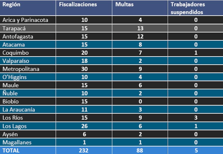 Tarapacá fue la región con más sanciones: 13 multas en 15 fiscalizaciones. Le siguió Antofagasta, con 12 multas en igual número de controles, y Los Ríos, con 9 multas y 3 trabajadores suspendidos. En la Región Metropolitana se aplicaron 9 multas en 30 fiscalizaciones.