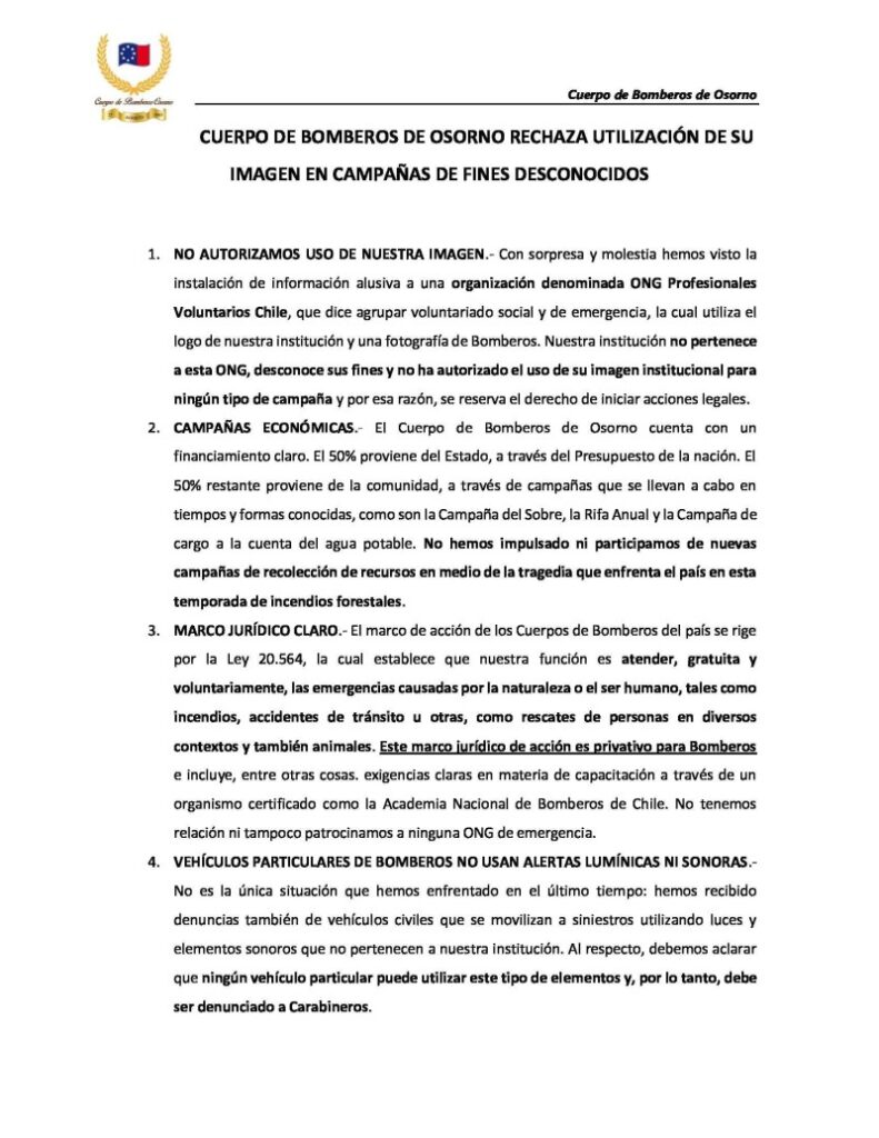 El Cuerpo de Bomberos de Osorno emitió una declaración pública afirmando que los voluntarios «rechaza la utilización de su imagen en campañas de fines desconocidos».