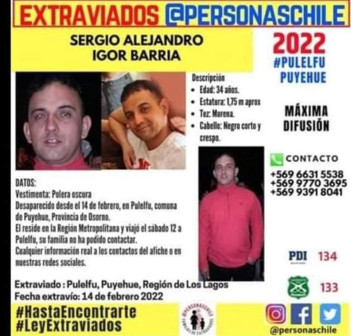 Se trata de Sergio Alejandro Igor Barría, de 34 años, oriundo de Santiago, región Metropolitana a quien el pasado 14 de febrero se le perdió el rastro en el sector Pulelfu, comuna de Puyehue.