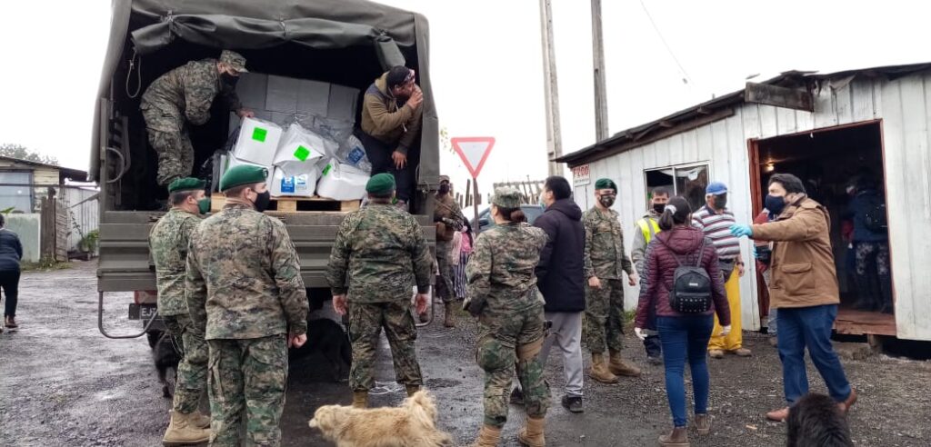 La entrega se hizo y continuará desarrollándose con el apoyo logístico de los profesionales de la Dirección de Desarrollo Comunitario de la municipalidad de Osorno, que han puesto a disposición de las autoridades, vehículos y personal humano para la distribución de la mercadería, donde también trabaja personal del regimiento Arauco de Osorno con un importante contingente de funcionarios, además de Carabineros de la prefectura 24.