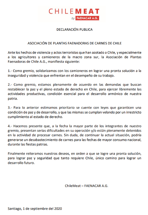 Por medio de un comunicado, la Asociación de Plantas Faenadoras de Chile A.G., manifestaron su total respaldo a las demandas y protestas que realiza la CNTC.