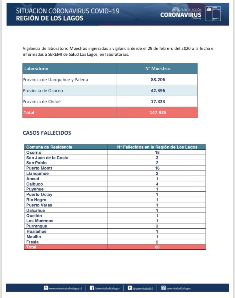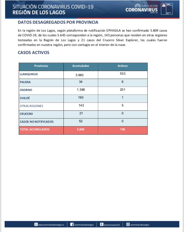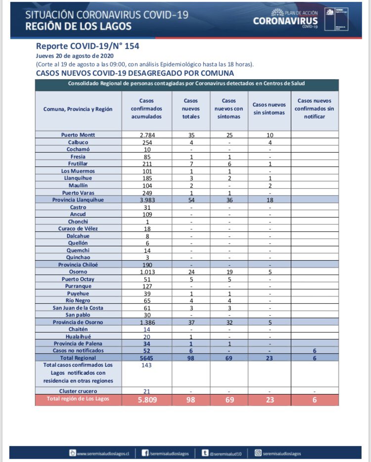 En un nuevo balance de Coronavirus para la region de Los Lagos, da cuenta de 35 nuevos casos para la comuna de Puerto Montt y 24 casos para Osorno.