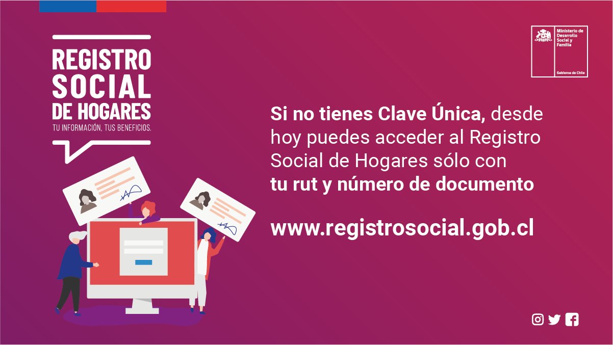 A partir de hoy todas las personas que quieran ingresar o actualizar sus datos en el Registro Social de Hogares podrán hacerlo sólo con su rut y número de documento (información disponible en el carnet), medida implementada para facilitar el acceso al registro debido a la emergencia por COVID-19.