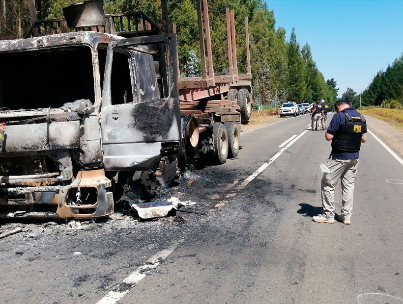 Otro ataque incendiario se reportó en la región de La Araucanía, esta vez, en la Ruta 49, de la comuna de Collipulli, lugar donde un grupo de al menos siete encapuchados amenazaron con un arma de fuego al conductor de un camión que se trasladaba por la carretera para posteriormente quemar la máquina.