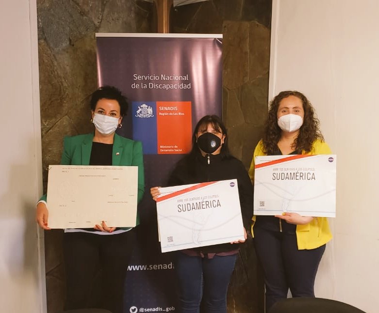 En vista de esta inédita oportunidad, la Dra. Olga Barbosa, Seremi de Ciencia, Tecnología, Conocimiento e Innovación de la macrozona Sur, entregó tres ejemplares del Atlas «Abre tus sentidos a los eclipses: Sudamérica» en las oficinas de la dirección regional de SENADIS Los Ríos, a su directora, Javiera Flores, y a Mónica Reyes, fundadora de la organización Ciegos del Sur.