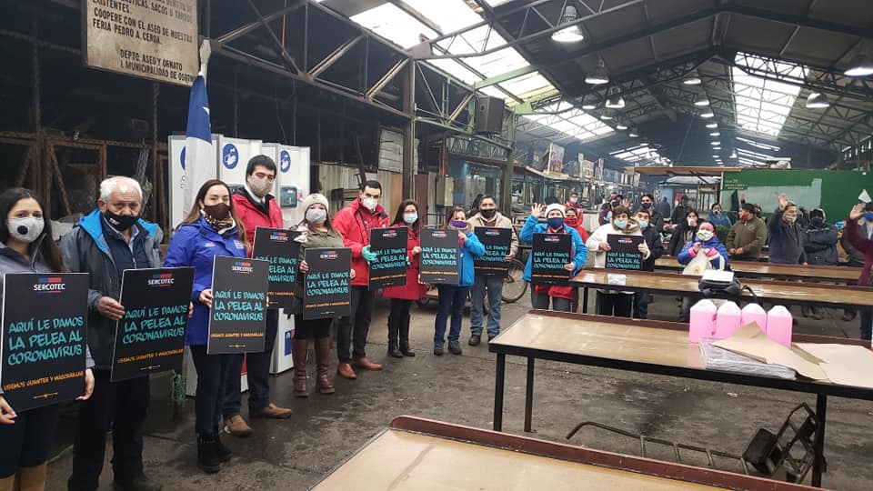 Cuatro totems de higienización, mascarillas, guantes, alcohol gel y afiches informativos para prevenir el COVID 19, fueron entregados a trabajadores de la Feria Pedro Aguirre Cerda de Osorno, en un acto donde encabezado por el Gobernador Mario Bello, junto al Subdirector Provincial de Sercotec Osorno, Alfredo Sepúlveda y acompañados de la Coordinadora del Centro de Negocios de Sercotec, Andrea Iturriaga, se desarrolló la iniciativa que busca respaldar a trabajadores y emprendedores en momentos de pandemia.