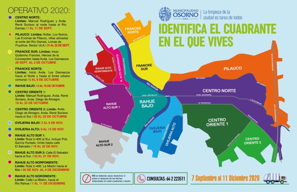 En tanto el Director (S) de Medio Ambiente, Aseo y Ornato, Fernando Santibáñez indicó que “este 2020 la campaña Osorno Ciudad + Limpia tiene la particularidad que el retiro de residuos será durante los días hábiles de cada semana, vale decir de lunes a viernes, por lo cual es importante que los vecinos y vecinas se mantengan informados respecto a sus sectores y fechas”.