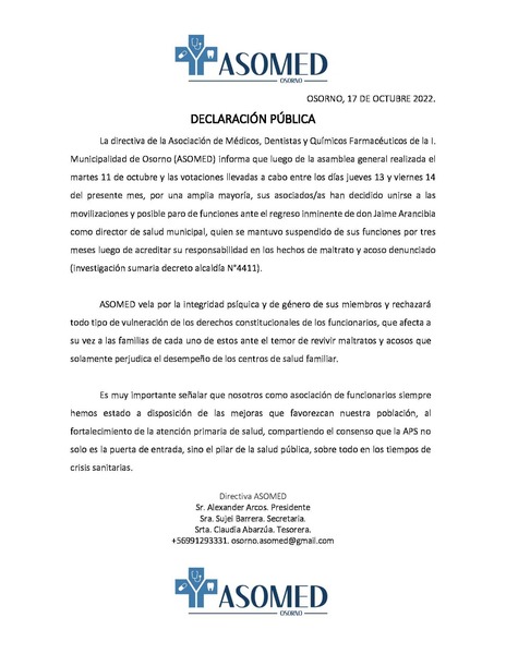 En un comunicado emitido por ASOMED, informan que los asociados y asociadas decidieron, por una amplia mayoría, el comienzo de las movilizaciones y de un posible paro “ante el regreso inminente de don Jaime Arancibia, quien se mantuvo suspendido de sus funciones por tres meses luego de acreditar su responsabilidad en los hechos de maltrato y acoso denunciado, según investigación sumaria decreto alcaldía n°4411”.