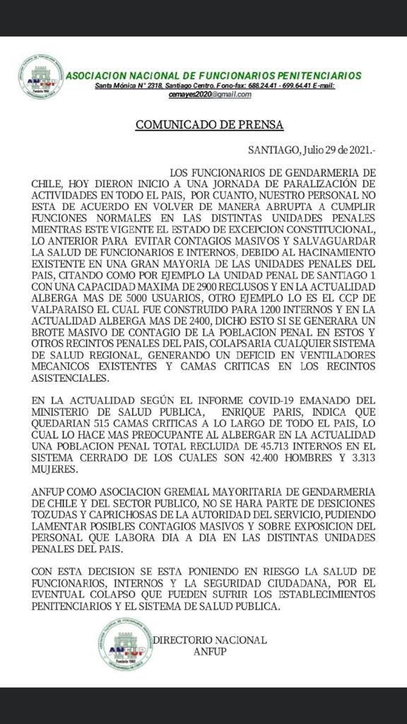 La Asociación Nacional de Funcionarios Penitenciarios (ANFUP), anunció mediante un comunicado la paralización de sus actividades en todo el país por posible contagio masivo de Covid-19