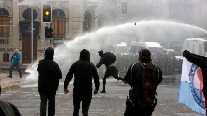 Si bien son cerca de dos mil las personas que participan de la marcha de manera pacífica que se trasladó por la Alameda y que se dirigía hacia Recoleta, en distintos puntos se produjeron serios incidentes.