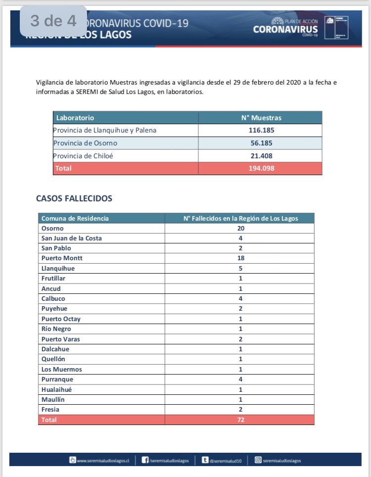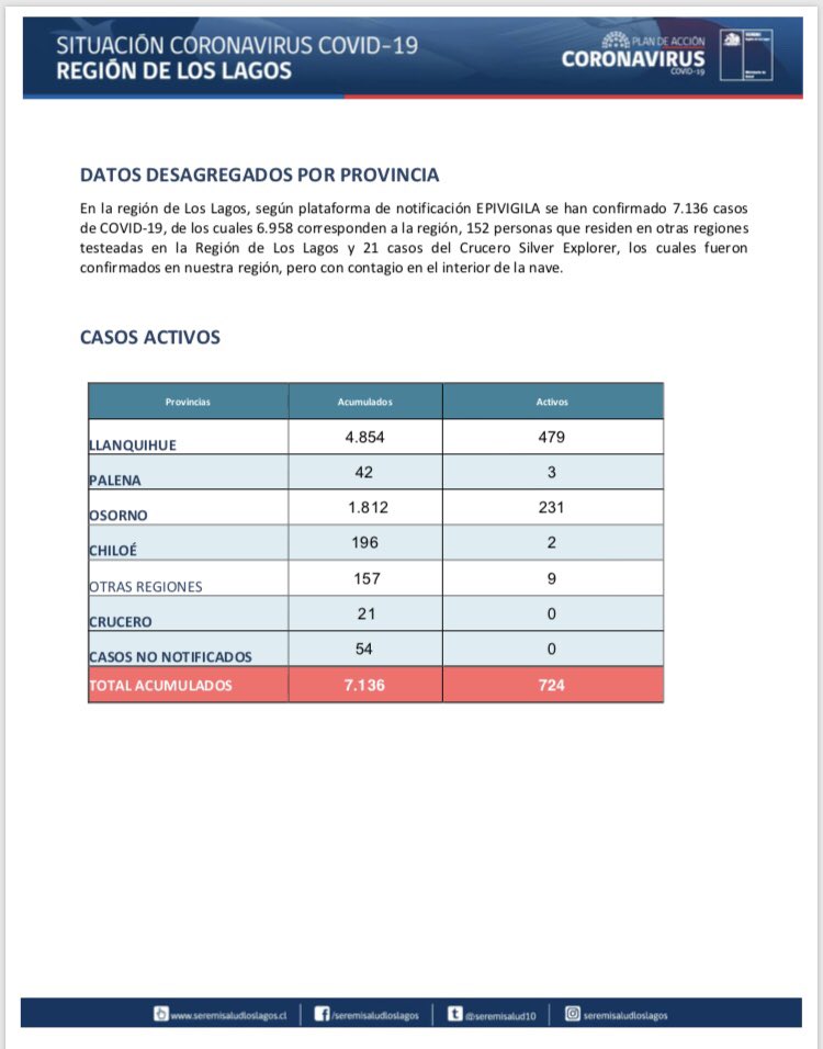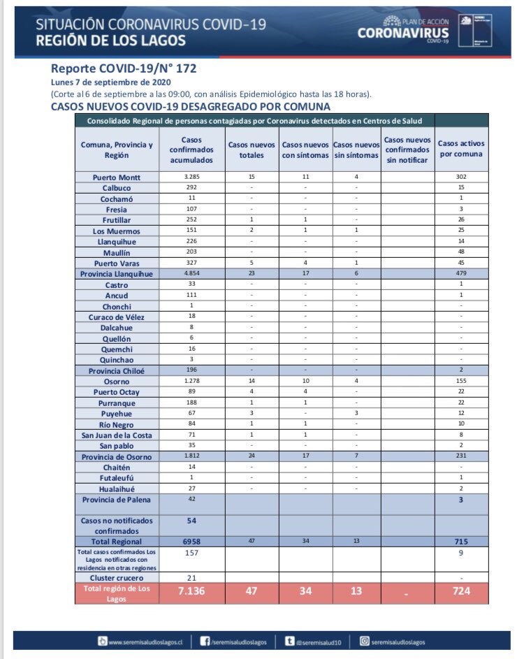En el balance de Coronavirus en la región de Los Lagos de este Lunes 07 de septiembre, se informó de 14 nuevos casos para la comuna de Osorno y 15 casos para la capital regional Puerto Montt.