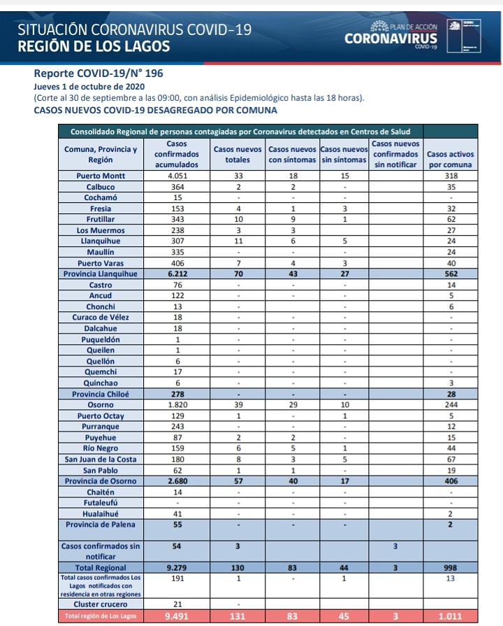En el balance de Coronavirus para la región de Los Lagos, da cuenta de 39 nuevos casos para la comuna de Osorno y 33 casos nuevos para Puerto montt.