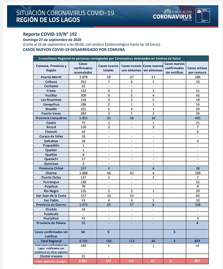 En el balance diario de Coronavirus para la región de Los Lagos, se informó de 46 casos nuevos para la comuna de Osorno. En tanto que la comuna de Puerto Montt, sumó 58 casos.