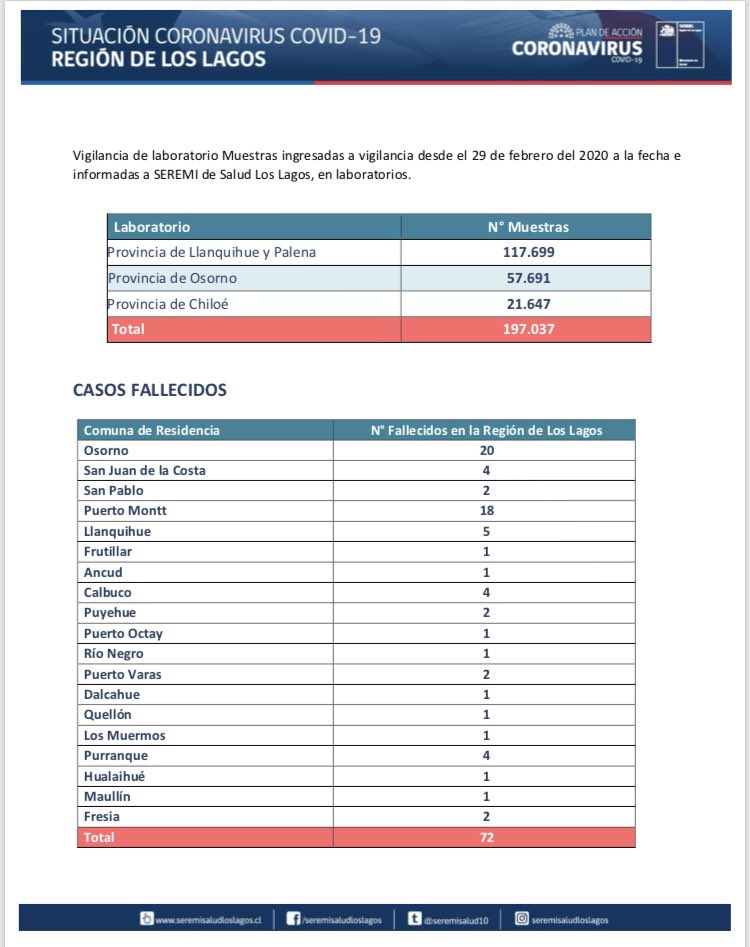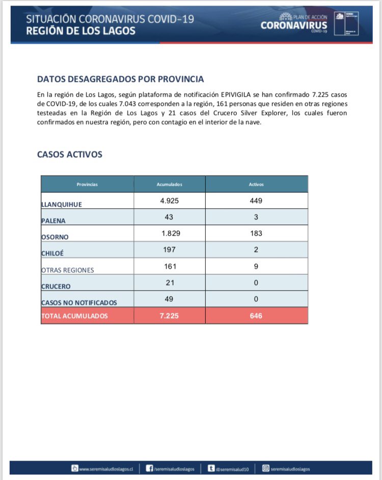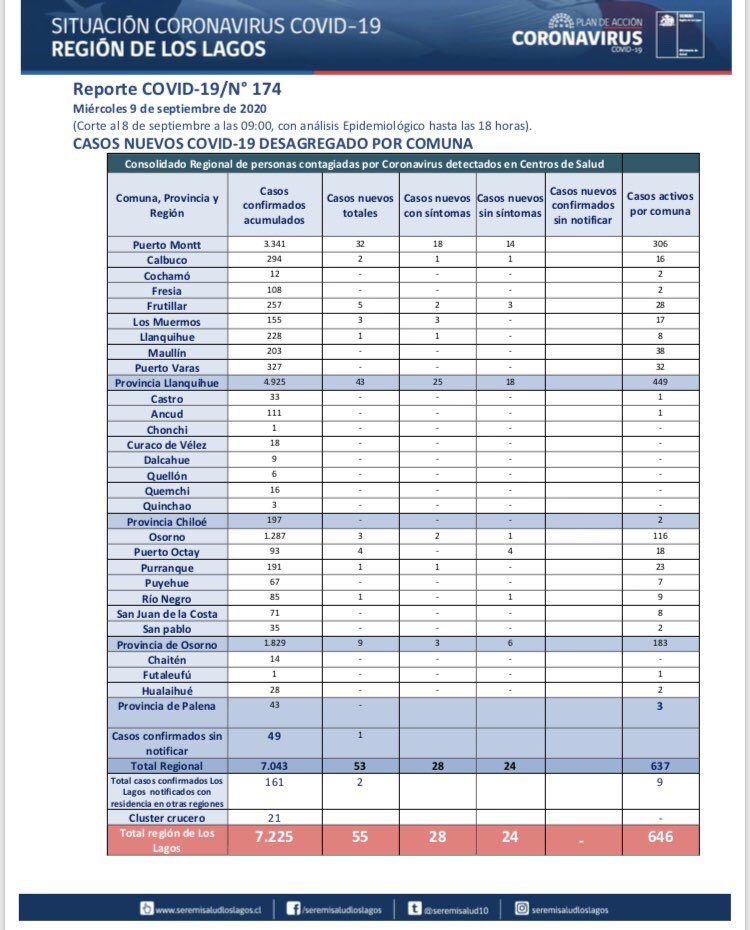 Este miércoles 09 de septiembre, el Informe de Coronavirus para la región de Los Lagos, dio cuenta de 32 casos para la comuna de Puerto Montt. En tanto que en la comuna de Osorno se sumaron 3 nuevos casos.