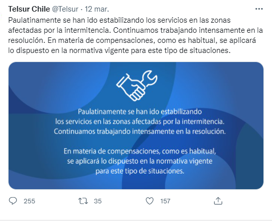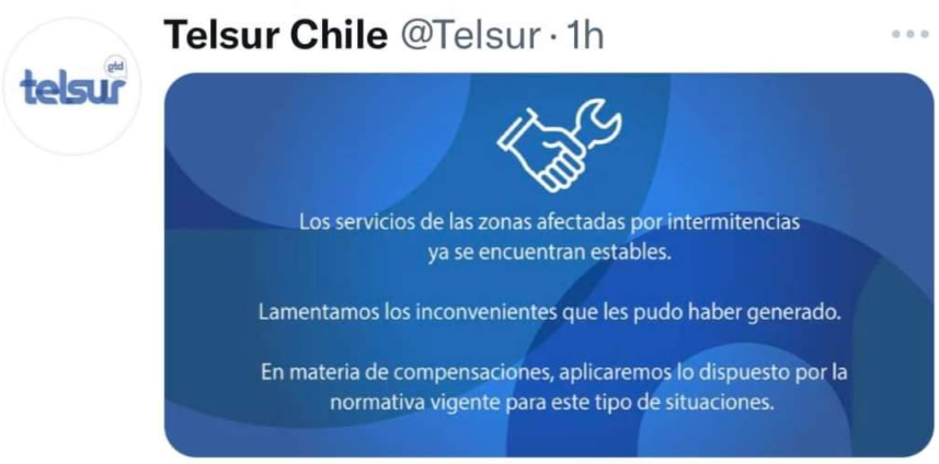 Algunos clientes de Telsur, establecen cortes en el servicio e intermitencia desde hace varios días, dejando sus quejas mayoritariamente en Redes Sociales y los canales de comunicación de la empresa, de los que ya tendría antecedentes la Subsecretaría de Telecomunicaciones (SUBTEL), institución de Gobierno encargada de las telecomunicaciones en el país.