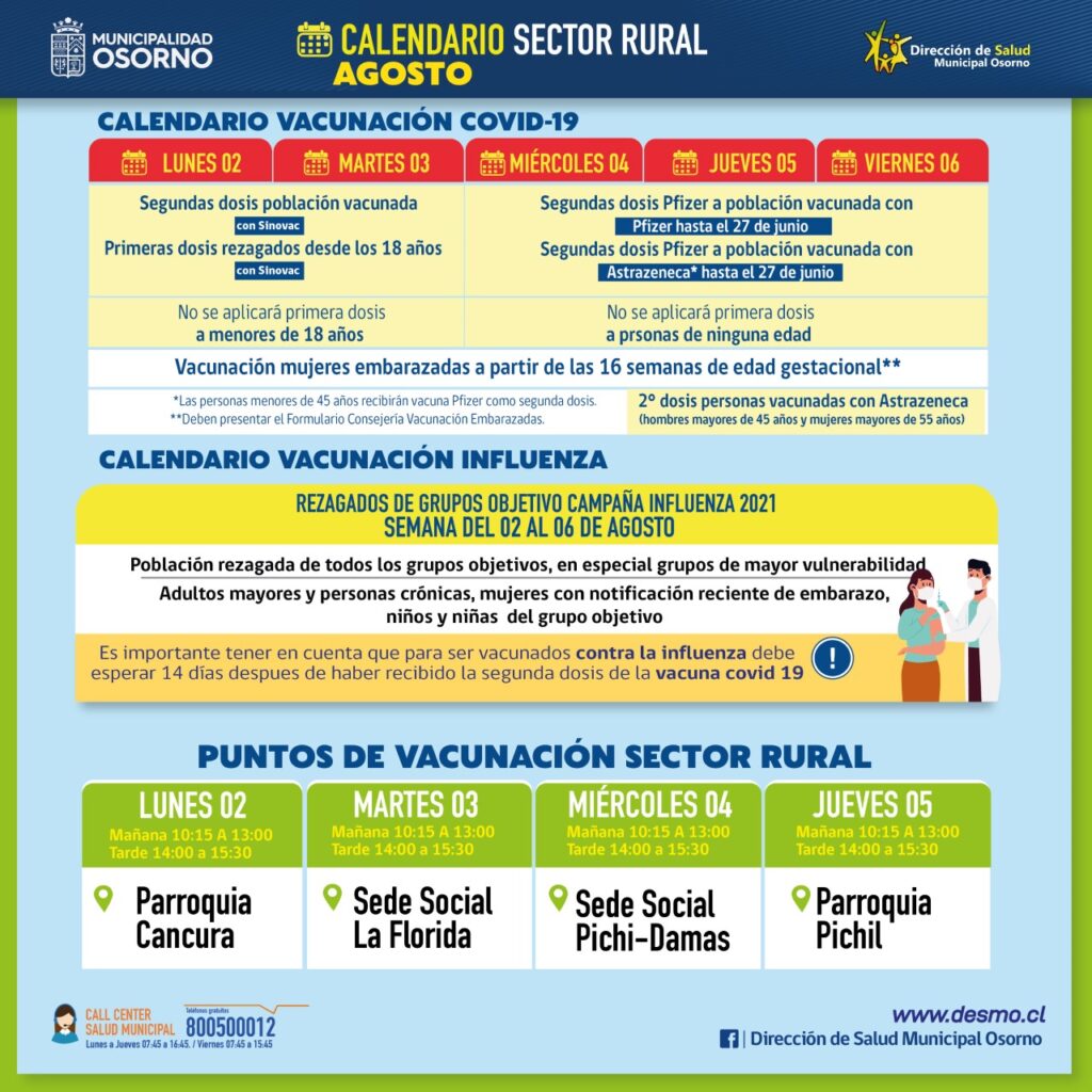 Los seis recintos de inoculación en Osorno atienden de lunes a jueves desde las 9 de la mañana hasta el mediodía y en la tarde desde las 14 horas hasta las 16. Mientras, que el viernes los vacunatorios atienden desde las 9 a las 14 horas en horario continuado.
