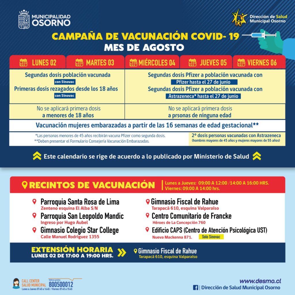 El calendario de vacunación comenzará este lunes 2 y martes 3 de agosto con la inmunización de segundas dosis con Sinovac y rezagados mayores de 18 años con el antídoto del mismo laboratorio. Por su parte se informó que ninguno de esos días se aplicará primeras dosis a menores de 18 años.
