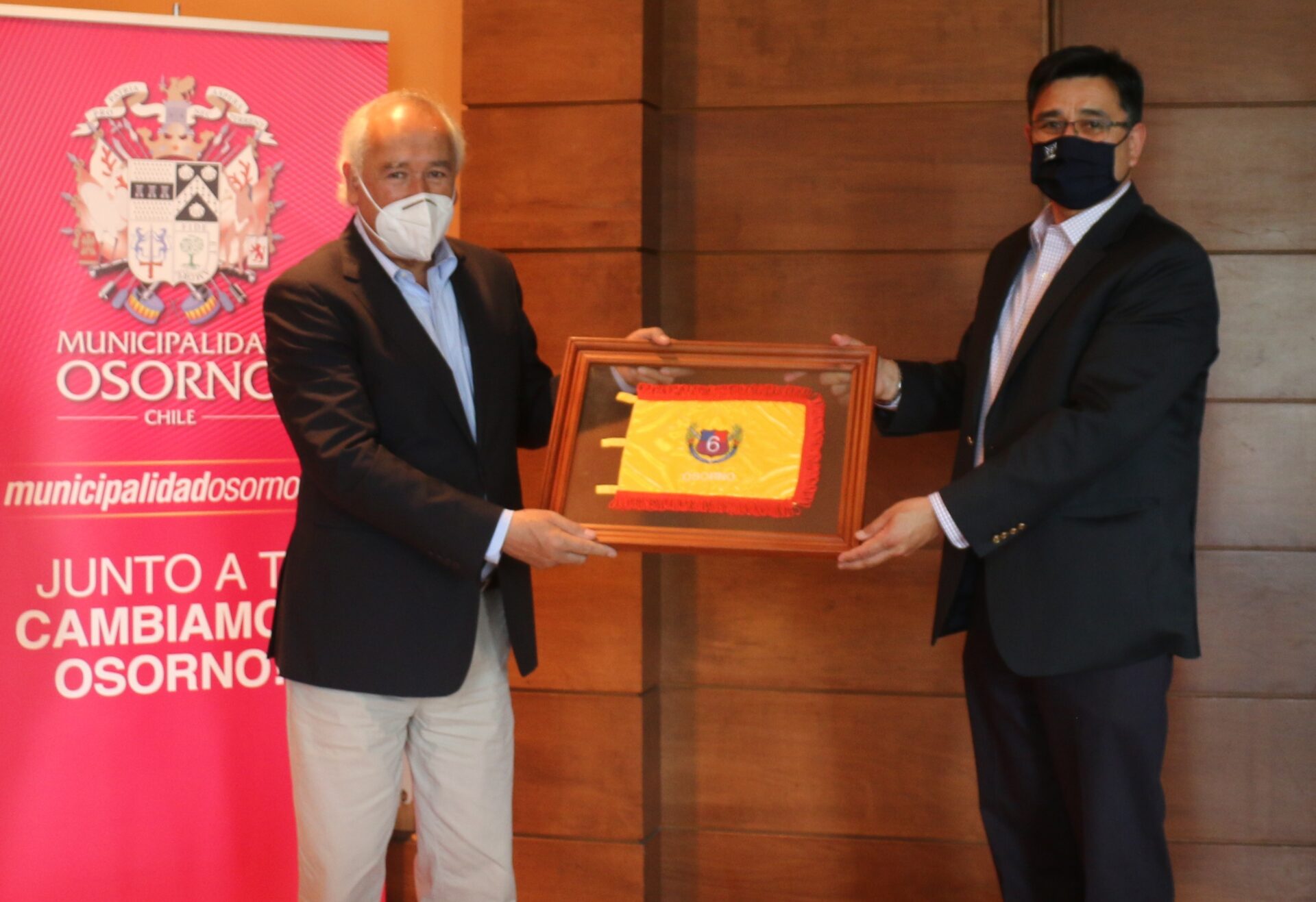 Finalmente, con la entrega de un “Gallardete”, bandera que acompaña a los carros bomba cuando se dirigen a un servicio, y que simboliza el acompañamiento y apoyo permanente del municipio de Osorno, representantes de la Sexta Compañía de Bomberos de Rahue agradecieron a la Corporación Edilicia, en la figura de su alcalde Jaime Bertin, todo el trabajo realizado para la obtención del financiamiento regional que permitirá la construcción de su nuevo cuartel.