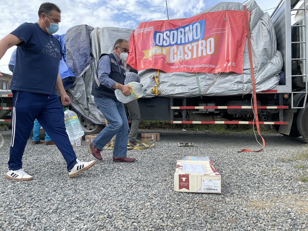 Hasta la Isla de Chiloé llegó una delegación del municipio de Osorno para entregar los cuatro mil 500 kilos de ayuda, consistente en alimento no perecible para humanos y mascotas, útiles de aseo personal, agua envasada, pañales y ropa de cama nueva; que donó Osorno en el marco de la campaña solidaria en beneficio de las familias de la población Camilo Henríquez de Castro.