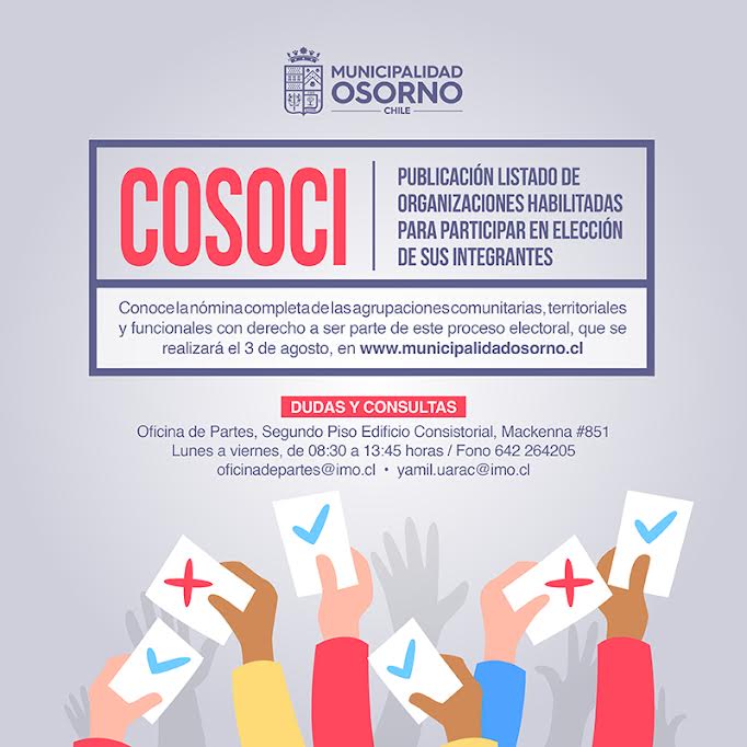 Ya se publicó el listado de organizaciones comunitarias, territoriales y funcionales habilitadas para participar en la elección para conformar el nuevo Consejo de Organizaciones de la Sociedad Civil (COSOCI) periodo 2023-2027, que es una instancia que lidera la Casa Edilicia local y que consagra, de forma efectiva, la participación real del mundo social, haciendo valer la voz de entidades relevantes del quehacer de Osorno.
