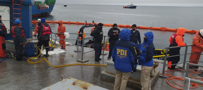 Detectives de la Brigada Investigadora de Delitos contra el Medioambiente y el Patrimonio Cultural de Valdivia, investigan el hundimiento de un pontón que pertenece a una empresa salmonera en el sector de Quillaipe en la comuna de Puerto Montt.
