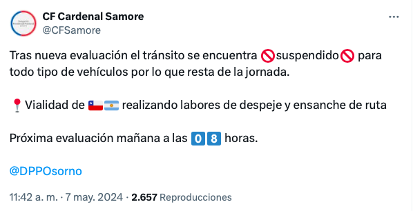 Este martes se confirmó una nueva suspensión temporal del tránsito para todo tipo de vehículos en el paso internacional Cardenal Samoré en la ruta CH215.