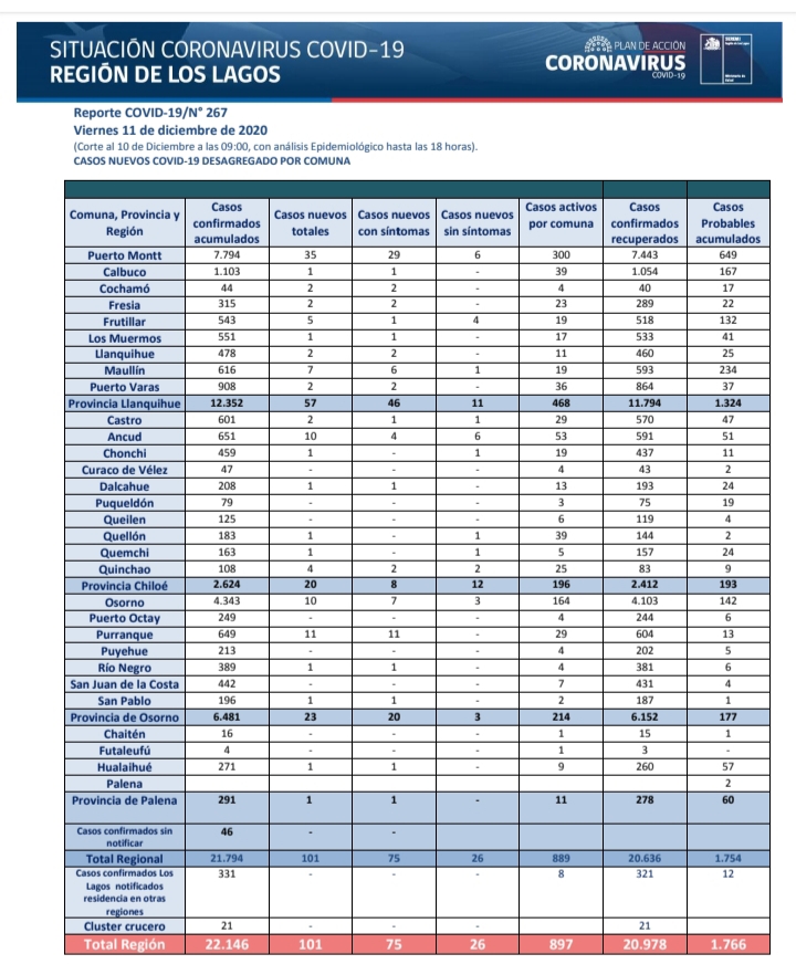 Este es el nuevo reporte de la Seremi de Salud de la región de Los Lagos detallado por comuna.