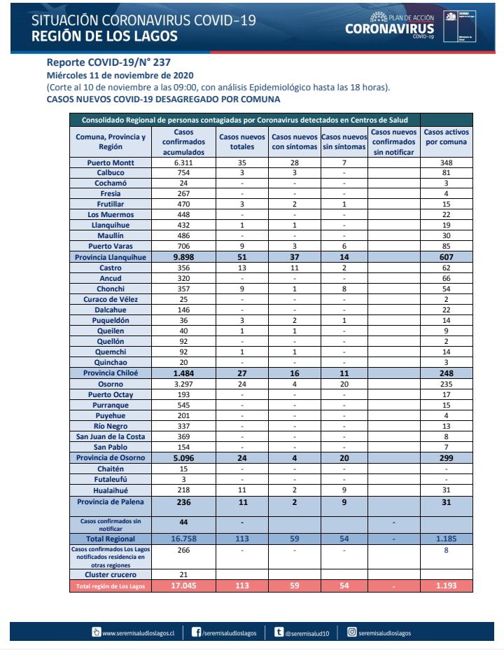 Este es el nuevo reporte que entrega la Seremi de Salud de la Región de Los Lagos para este miércoles 11 de noviembre del 2020.
