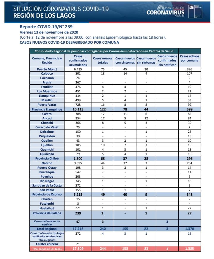 Este es el nuevo reporte de casos de Covid 19 en nuestra region de Los Lagos, detallado por comuna.