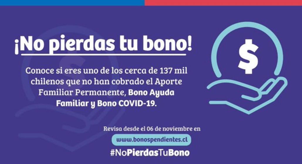 La autoridad informó que se dispuso del sitio web www.bonospendientes.cl donde, con solo con el RUN y fecha de nacimiento, las personas podrán saber si tienen uno de los tres bonos pendientes de cobro (“Bono Covid”, “Bono Ayuda Familiar” y “Aporte familiar Permanente”) en el mismo sitio se indicará el lugar de cobro que se les asignará.