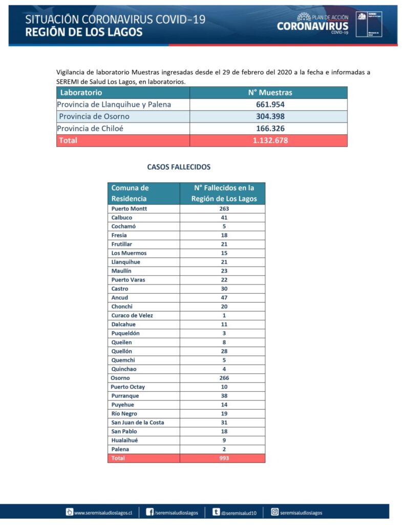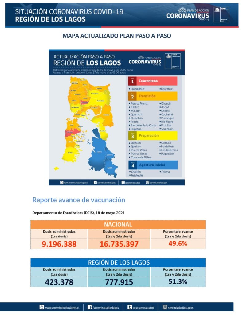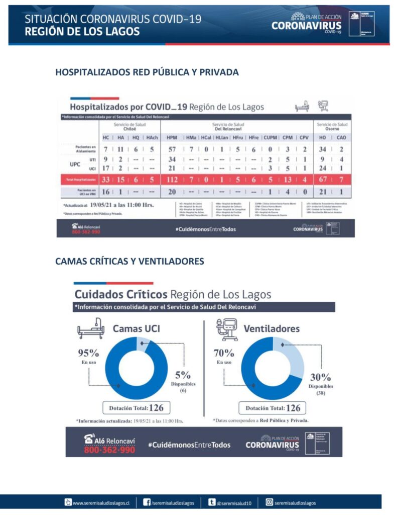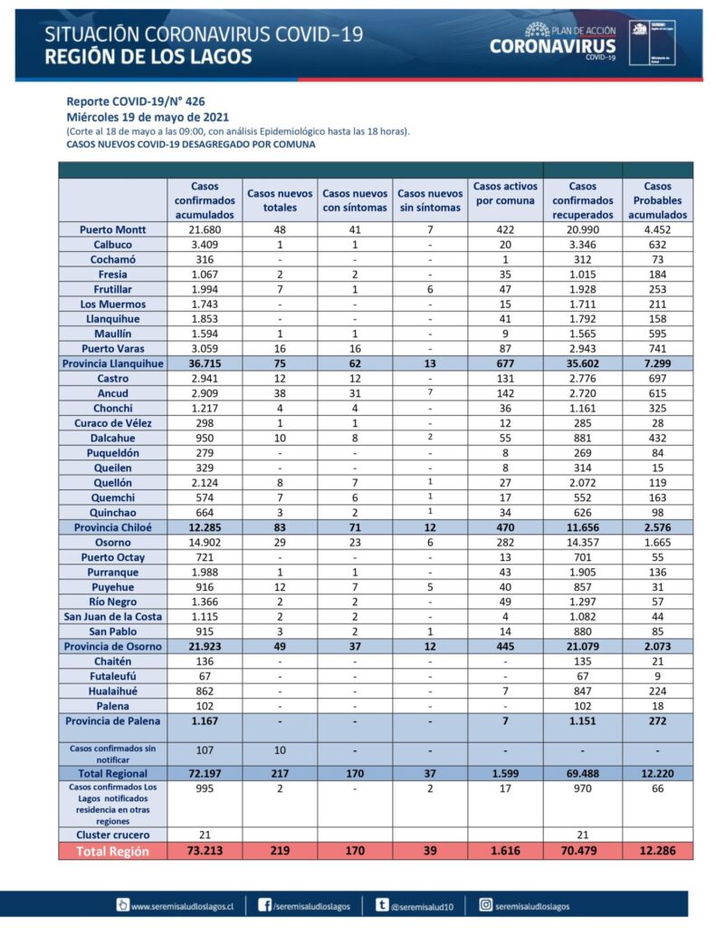 Casos de Covid-19 según el informe entregado por el Seremi de Salud de la Región de Los Lagos, al mediodía de este 19 de Mayo, la provincia de Llanquihue registra 75 casos nuevos de Covid19, destacando Puerto Montt con 48. La provincia de Osorno informa 49 casos nuevos, correspondiendo a la comuna de Osorno 29.