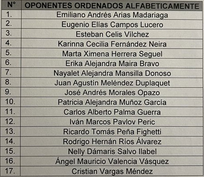 En el listado aparecen seis mujeres, y entre los nombres destacados están el del fiscal regional de O’Higgins, Emiliano Arias, y el de la Defensora de la Niñez, Patricia Muñoz. Recordar que Abbott dejó el cargo el pasado 1 de octubre al cumplir la la máxima edad permitida (75 años).
