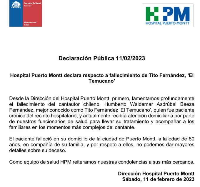Humberto Baeza Fernández, conocido como Tito Fernández o «El Temucano», falleció a los 80 años, según confirmaron desde el Hospital de Puerto Montt.