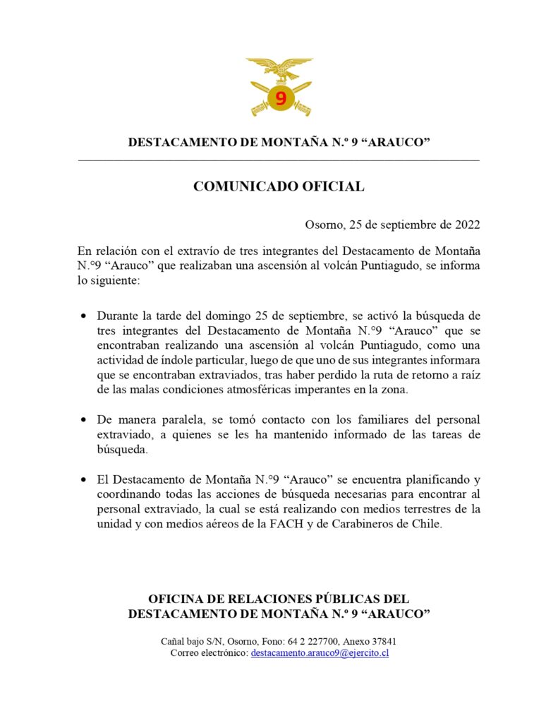 Se trata de un oficial y dos clases que pertenecen al Destacamento de Montaña Arauco de Osorno quienes son intensamente buscados desde la tarde de este domingo 25 de septiembre en el volcán Puntiagudo.